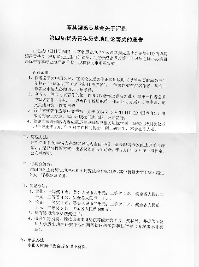 谭其骧禹贡基金关于评选第四届优秀青年历史地理论著奖的通告