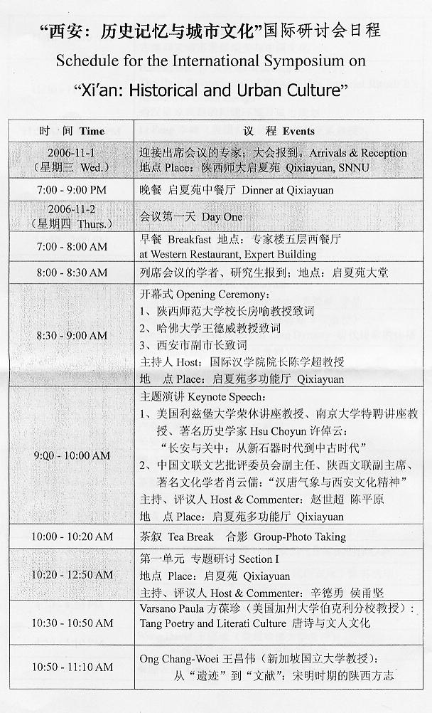 国际会议预告 “西安:历史记忆与城市文化”国际研究讨会将于11月2~3日在我校举行,届时将有许多知名历史学家到会,如许倬云等。希望我院研究生和本科大四学生到时积极与会。以下是会议议程:
