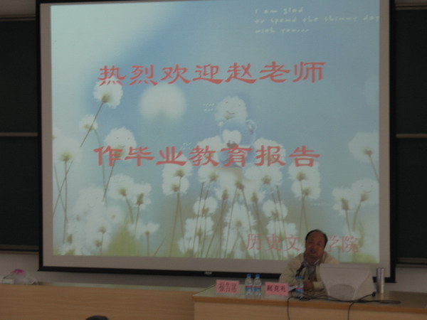 6月20日下午,我院邀请赵克礼老师为2007届毕业生做了一场题为“人生的机遇与梦想”的报告会。报告会由学院党总支副书记杜海斌老师主持,2007届学生辅导员郭响宏老师及全体毕业生参加了本次报告会。 报告会上,赵老师...