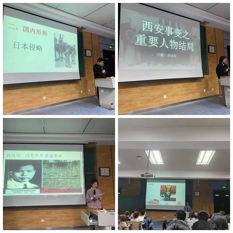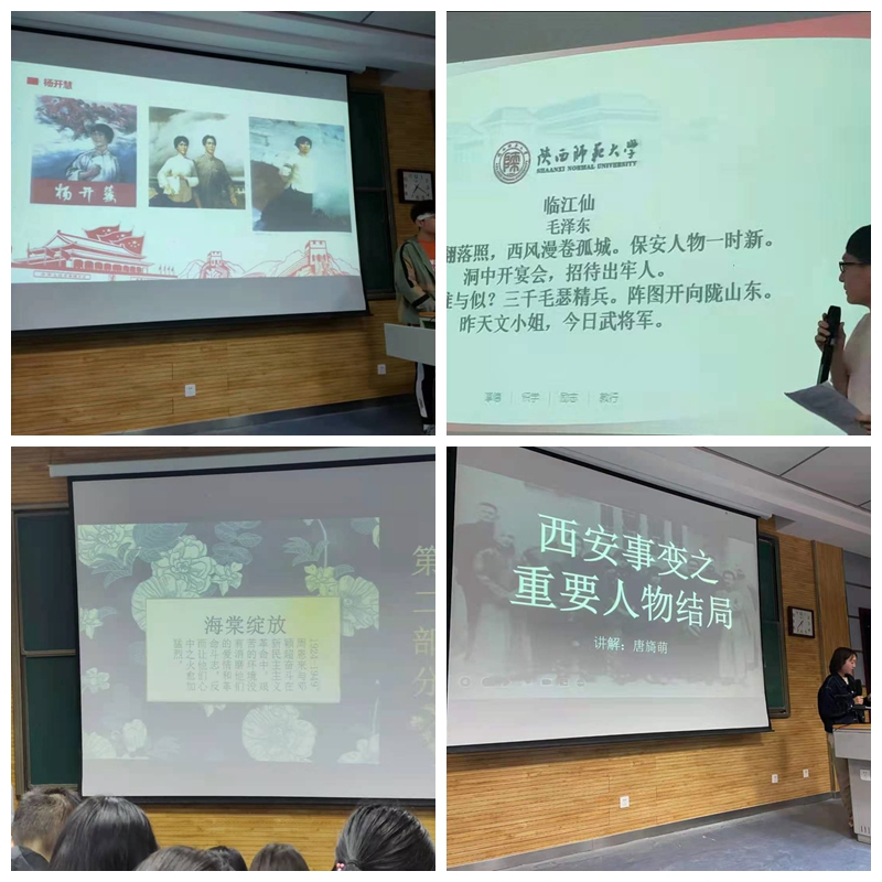 比赛以班级为单位,按照选手们的抽签顺序有序开展。选手们从历史小切口入手,用一个个或令人感动、或令人敬佩的故事,弘扬一代又一代共产党人不灭的爱国精神,展现党的百年历史。历史学一班通过一封封书信带我们重温周恩来、邓颖超的革命情谊;历史学二班以“艰难困苦,玉汝于成”为主题,向我们娓娓道来几位革命先烈的伟大事迹;历史卓越教师实验班围绕西安事变,探索我们身边的党史故事,彰显了一位又一位有血有肉的革命党人。历史学类一班,以血肉之躯筑起革命长城为主题,与我们回顾慷慨激昂的革命风云;历史学类二班带领我们重温了三封家书,字字珠玑,篇篇动人,中国共产党员的爱国奉献之情映于纸上;历史学新文科班详细讲述了命运多桀的女革命家——丁玲的故事,描绘了一位思想独立、不惧人言、敢于斗争的新时代女性。