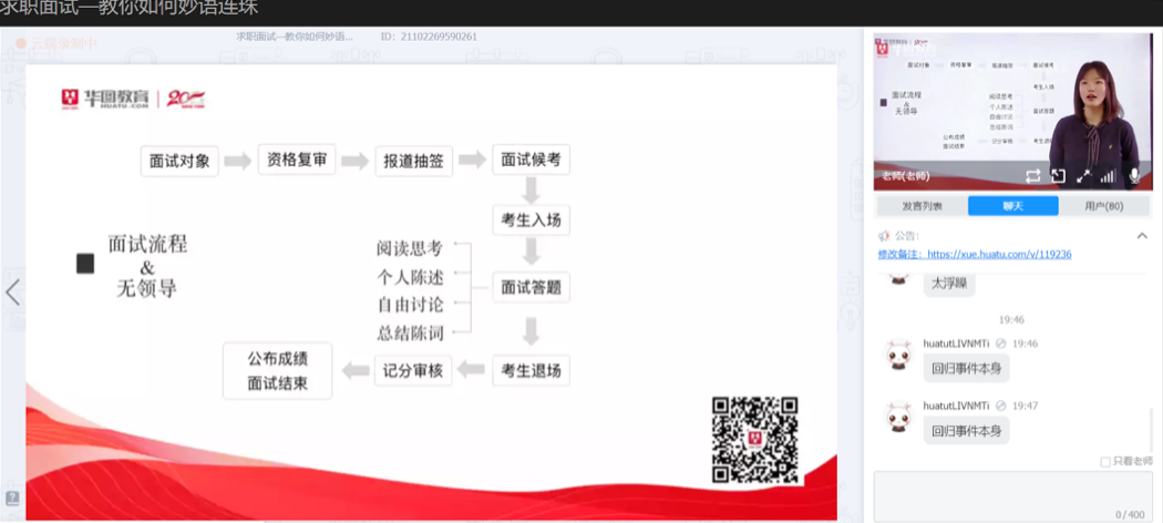 本次培训邀请到了陕西华图教育的李欣悦老师作为主讲,就无领导小组面试技巧、结构化面试技巧、非结构化面试技巧等方面内容分别向同学们进行讲解。李欣悦老师为大家详细介绍了无领导小组讨论的类型、题型、流程、答题策略等,并列举了具体案例,以加深同学们的理解,对于同学们提出的问题也都一一做了详细的解答。