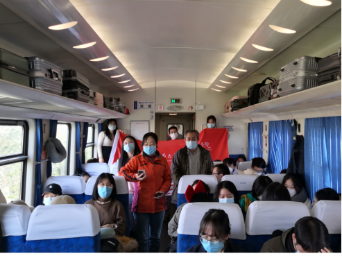 同时,老师们和班级负责同学向同学们强调疫情防控的重要性,提醒同学们在火车车厢这种密闭环境中戴好口罩,注意防护。