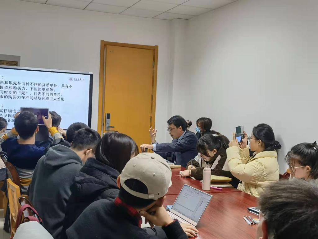 石涛老师从“错综复杂的银两”、“五花八门的银元”、“频繁变化的纸币”三个方面阐释了论文撰写的基本脉络,向同学们详细讲述了近代中国货币制度的变革过程,并由此总结出三个结论:银两与银元是不同的货币单位,具有不同的价值和购买力,不能简单相等;不同时期的“元”代表着不同的货币;货币的购买力在不同时期有着巨大差别。