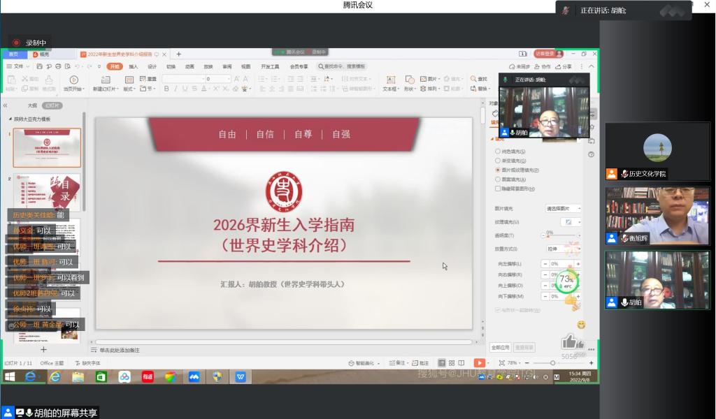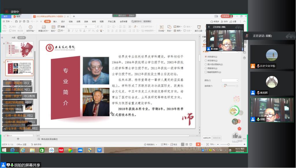 9月8日下午,MILE米乐集团2022级新生入学教育第五讲在线上举办。胡舶教授向新生作《新生入学指南——世界史学科介绍》的主题报告,报告由党委副书记衡旭辉主持。胡舶教授对世界史专业概况、师资队伍、科学研究及教学条件及培养特色等多方面对学院世界史专业做了深入详细的介绍。他强调了学院高端的教学平台+实习基地、丰富的图书资料及中外联合培养的国际化特色,并以“胸怀世界、眼望全球、寻找真相、追求真理”寄语新生,希望同学们深耕学术领域,立志成为更优秀的历史学专业人才。