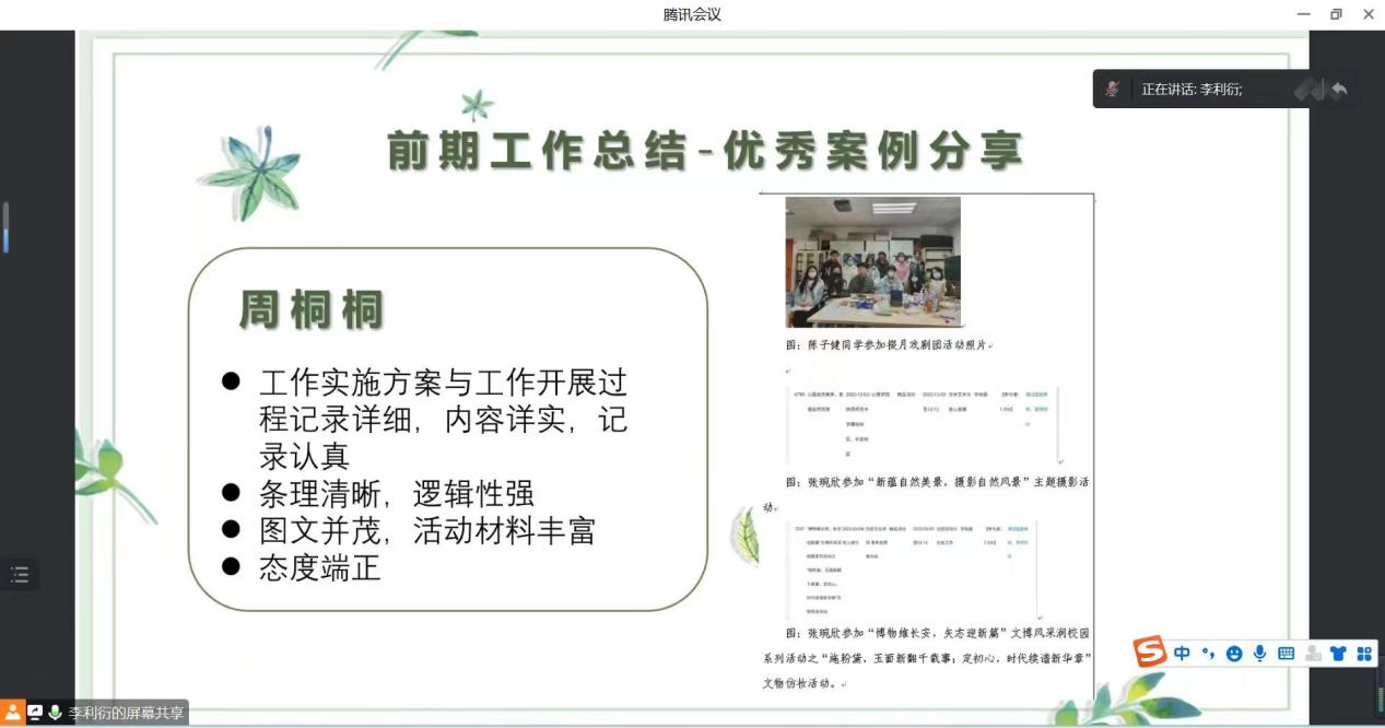 会上,李利衍带领大家一同回顾了本届“学长制”工作启动以来的基本情况,对中期考核结果进行了公布和说明。本次考核依据各团队提交的中期工作报告,评选出45个A级团队,并对周桐桐、刘琪琪、康茜等同学的优秀案例进行了展示宣传。随后,李利衍代表工作小组介绍了下一阶段工作的整体安排,对学长在新生德智体美劳适应性发展中发挥作用提出了更加具体的要求,希望大家进一步提高工作的积极性和创新性,努力实现自己与结对新生在思想、学习、生活、工作以及心理上的共同进步。