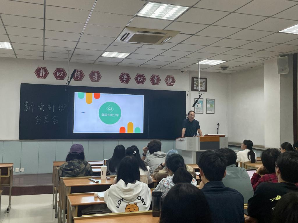 紧接着,郭响宏副院长针对新文科班的意义及政策做了详细阐述。他首先介绍了新文科班作为国家级实验班的地位,以及在新文科班开设这几年取得的成果。然后就同学们关心的发展前景和学校学院的政策支持进行了说明,阐明了新文科班作为培养复合型人才的班级的学业前景,激励同学们多阅读,融合技术实现专业发展,立足更广阔的视野认识世界。