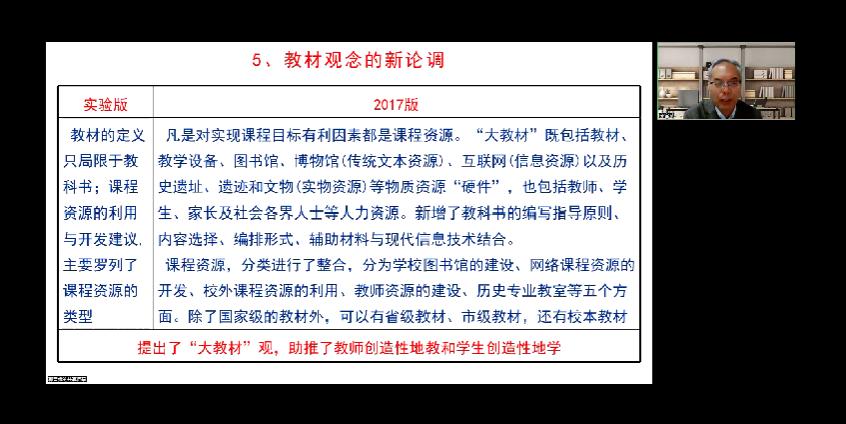 讲座中,郭富斌老师首先指出“备课一定要以课标为根本之指导”,详细分析新课标中对课程性质的新认知、基本理念的新观念、课程内容的新结构、教材观念的新论调以及学习方式的新方法,其中着重强调素质教育的内涵,落实其与教育改革相衔接,并提炼了2022年义务教育历史课程标准的变化与突破。随后,郭老师从课程呈现、课程体系、课程目标、课程本质以及课程实施入手,讲述历史课程的变化与特点。最后,郭富斌老师在论及教学艺术时,通过导入案例的方式,指出要有明确的教学主题意识,聚焦学生发展的需求。