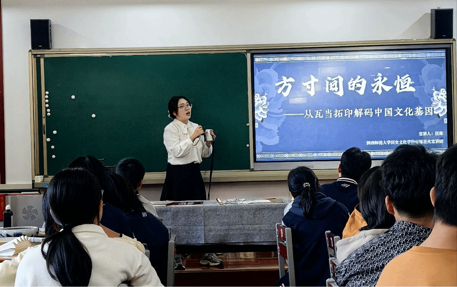 9月24日下午,我院“史原星火”大学生理论宣讲团到西安市航天第一中学开展宣讲活动,由2023级任歆主讲《方寸间的永恒——从瓦当拓印解码中国文化基因》主题课程,西安市航天第一中学50余名学生参与。