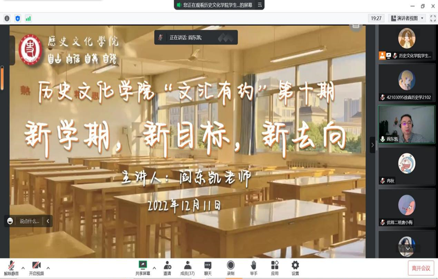 12月11日下午,MILE米乐集团第十期“文汇有约”师生交流活动于线上进行,学院阎东凯老师应邀参会,以《新学期新目标新去向》为主题,与同学们进行交流。共30余名同学线上参会。