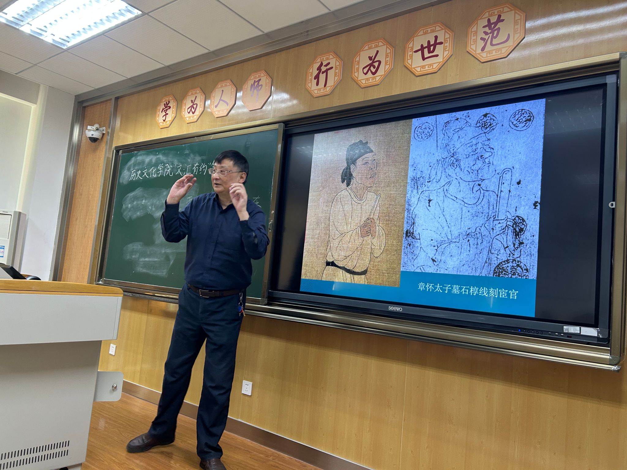 在教师分享环节,徐涛以《鸿门宴》为导入,分别介绍了记录、研究历史的三种方法:历史学、考古学、美术史学,罗列了各家方法的优劣并提出应对历史研究领域的新思维多加考虑。随后,徐涛结合三个案例:铜镜铭文与王莽政治理念的传播、《步辇图》与图像史料、仕女画和武周时期女性形象的变迁,说明了通过器物和图像推进政治史研究的具体途径。此外,徐涛讲解了《长相思》中“明镜”一词的含义,并强调民间记忆是重要的知识来源。