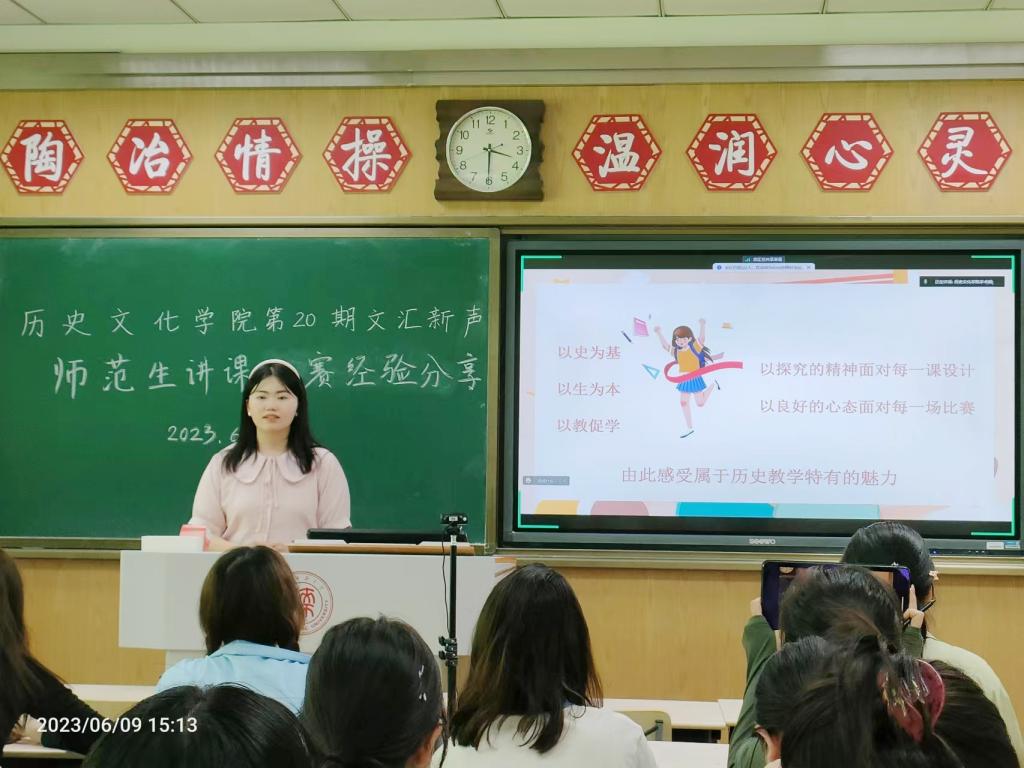 汪静以“当我们走上讲台”为题,强调“走上讲台前”应当对学生学情进行分析,要在教材解读基础上进行教学设计,“以史学为基础”、“以课标为导向”、“以观点为补充”,有所选择地呈现PPT的内容,着装上也应有所注意。关于“走上讲台时”怎样展现出一节符合预期的课,汪静认为师范生应当具备一定应变、表达、书写技能,以较为理想的个人状态与学生进行自然合适的互动,鼓励同学们以史为基、以生为本、以教促学。