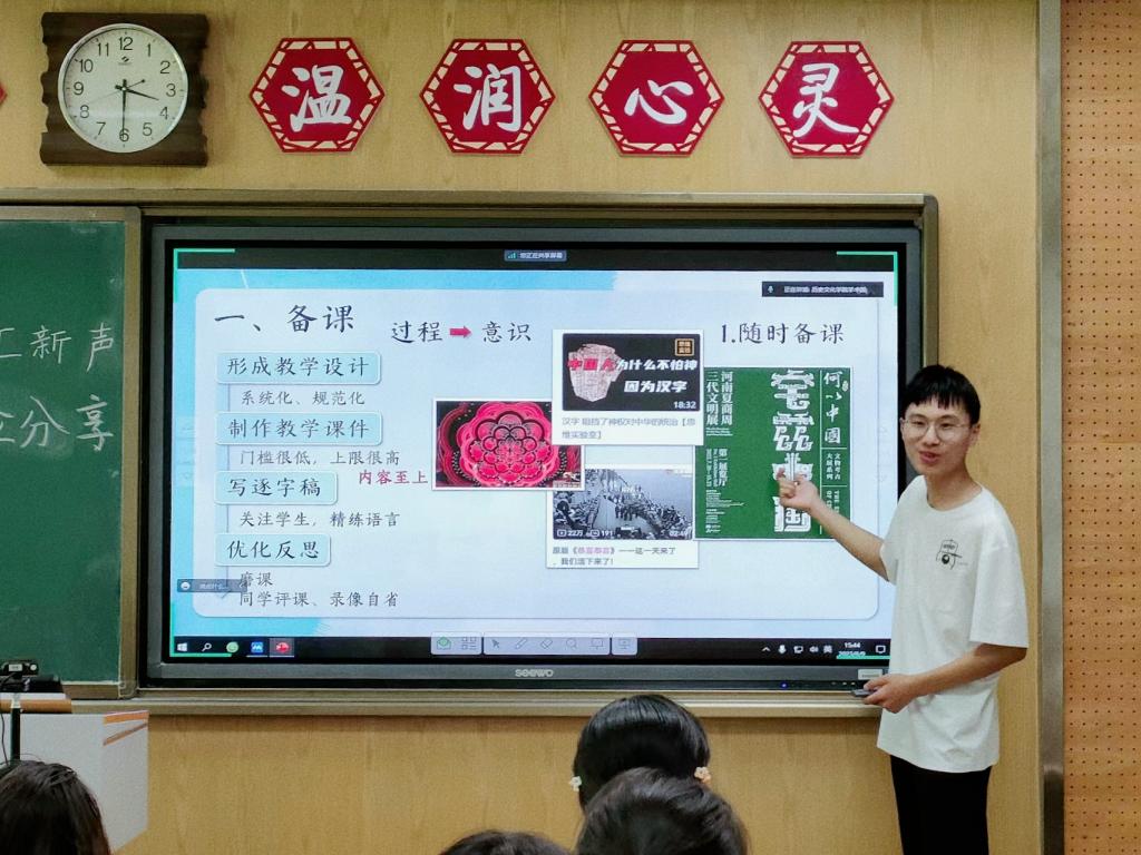 王哲文分享了备课的思路与心得,通过自身课例,强调备课应当要理解课标、整理课本、明确主题与重难点;在处理教学环节时要“想衔接、想引导、想问题、想效果”,形成系统化和规范化的教学设计;制作课件时应注意“内容至上”,发挥其工具性和特色性;逐字稿要精炼语言、问题导向、关注学生;最后可以通过同学评课、录像自省、反复磨课等方式进行优化反思。王哲文还建议要养成随时备课的意识,多听多记,建立素材库,与志同道合的伙伴一同进步。