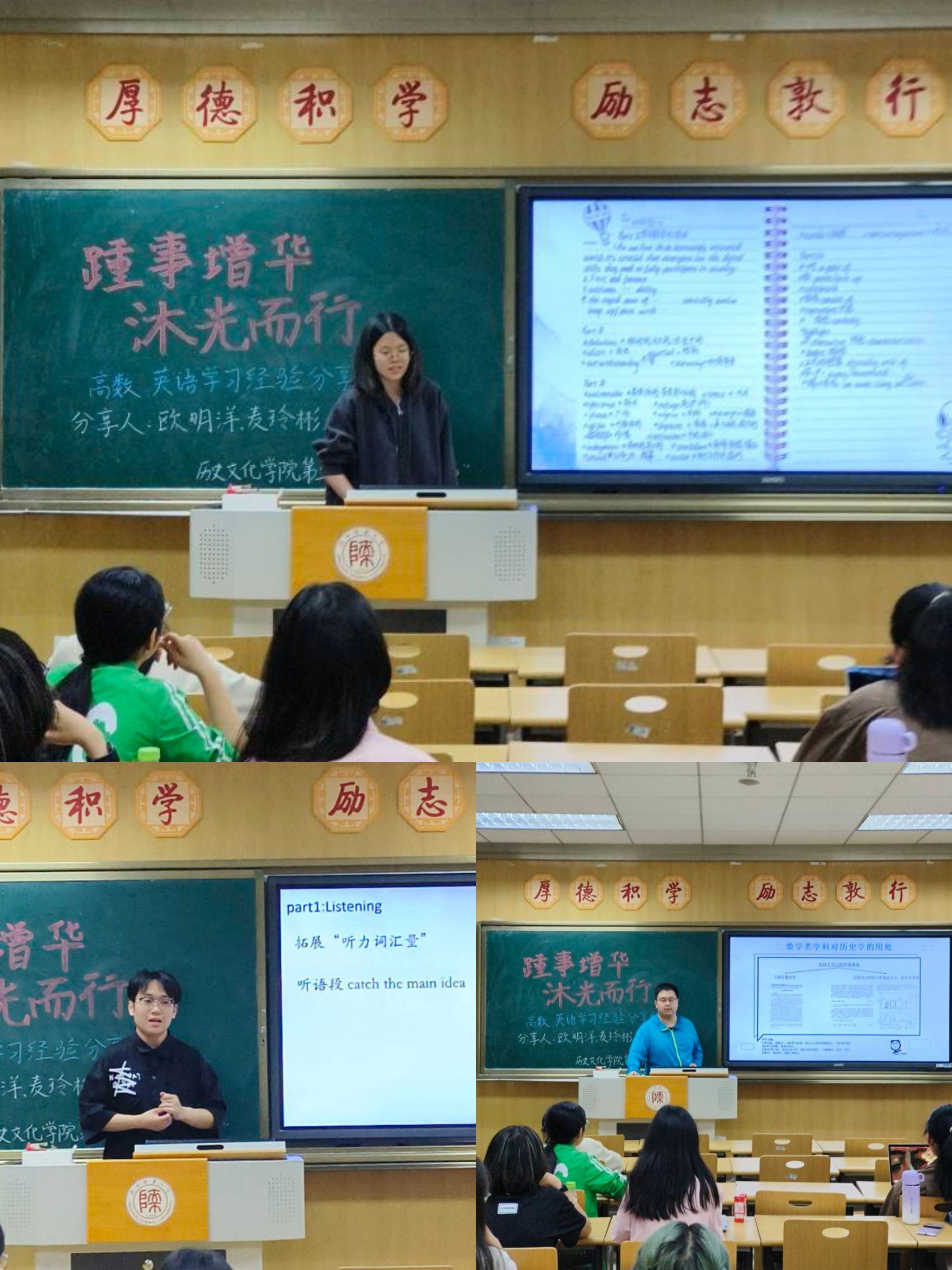 活动中,欧明洋以雅思考试为例,深入分析了听、说、读、写四个方面。他强调答题中“理解胜于翻译”的原则,指出在英语写作中应考虑欧美文化下的写作逻辑,并根据自己的学习经历,推荐了一系列实用的应用程序和网站,并建议同学们将英语学习融入日常生活中,激励同学们不断提升英语水平。麦玲彬则从考前准备、考试心态和答题策略三个方面分享了自己的经验。她详细介绍不同题型板块的练习方法和答题技巧,帮助同学们更好地备战考试。金澍昆以计量经济学和历史建模为例,展示了数学在历史研究中的应用,阐述了数学工具对历史研究的意义。随后,他通过具体题目的讲解,分享了提高数学成绩的策略。