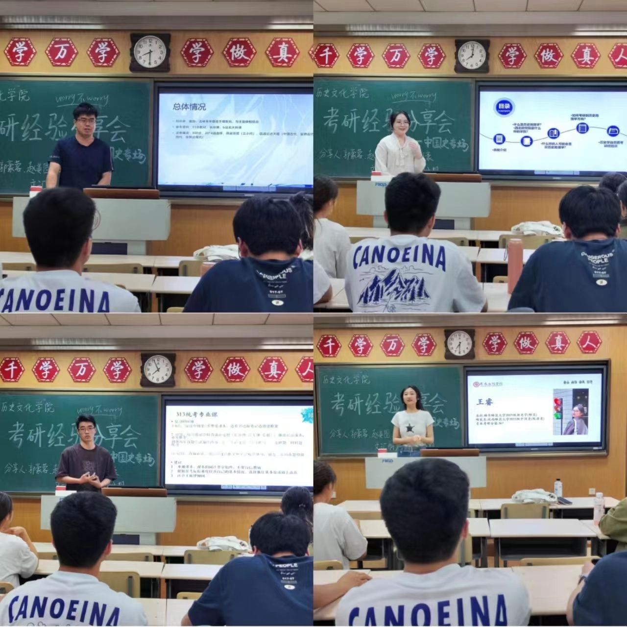 中国史部分由王睿首先介绍了考研对本科生的定位与需求,提供了专业和就业方面的不同择校策略。随后,赵姜圆主要介绍了择校中自命题与统考的区别以及有关考研心态和生活方面的指导。郭豪蓉则提出应当重视真题和学科的前沿动态,复习上应当保持深度。最后,郑骏豪再次强调择校、考研流程和复习规划的内容。