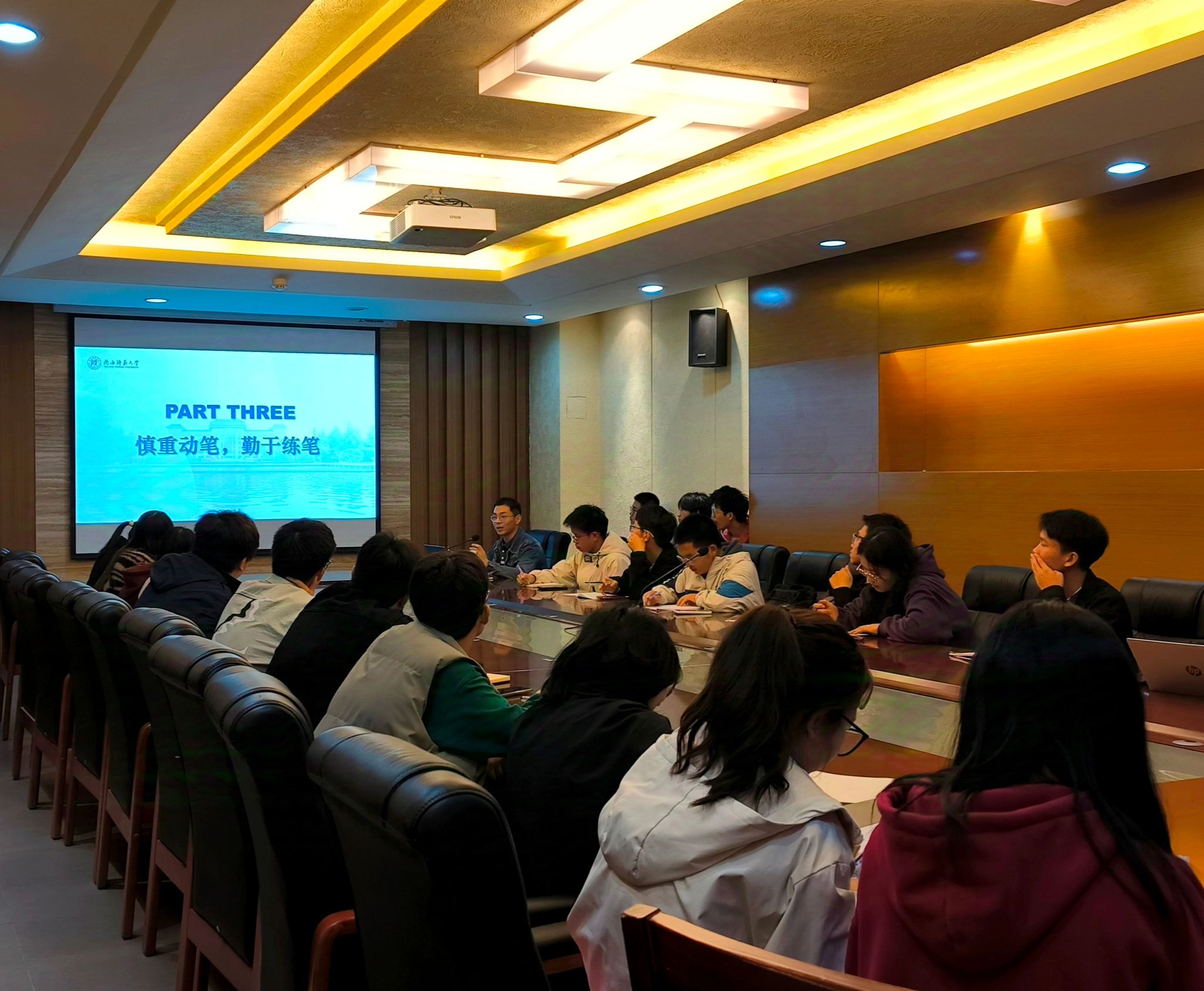 随后,吴老师强调论文写作并非易事,要摒弃畏惧,树立信心,注重论文内容雕琢,相信自己。同时提醒同学们务必慎重动笔,勤于练笔。针对论文选题的问题,吴老师提出做好论题研究综述,衡量写作必要性,多练多写的建议。最后吴老师指出好文章都是改出来的,论文基本格式、标点符号和文章注释需要不断打磨,注重规范。