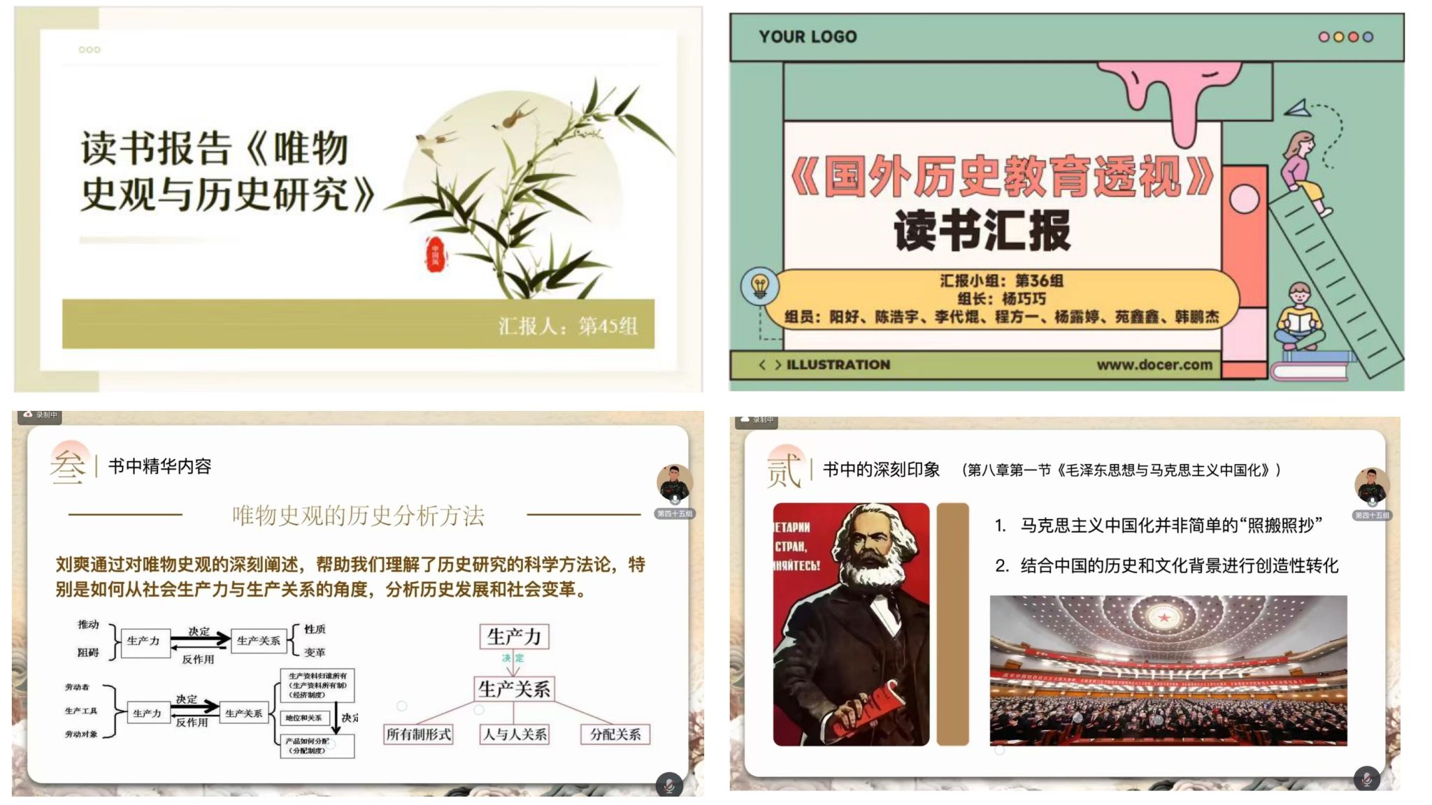 2月10日上午10时,读书会通过线上会议形式正式开始,各小组聚焦“历史研究”与“历史教育”两大专题,以读书报告、讨论稿、多媒体课件等多种形式展示了小组成员的阅读成果与深入思考。各组汇报人多从历史研究视角出发,提炼书中核心观点,结合成员阅读感悟与指导学长学姐教学经验,阐述其对于历史教育实践的帮助。