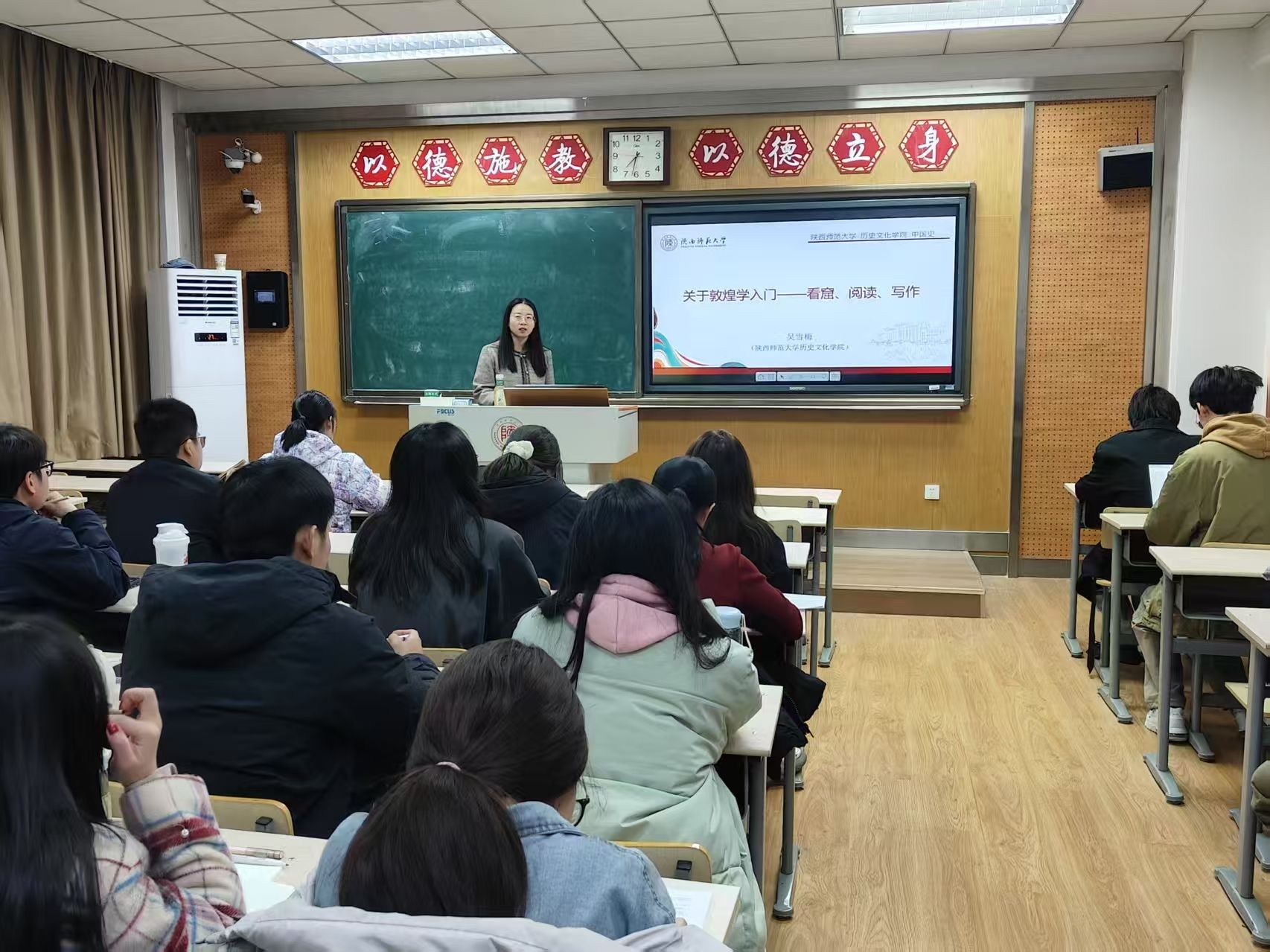 活动伊始,吴雪梅系统梳理敦煌学的学科框架,指出敦煌学是以敦煌石窟、敦煌文献为核心研究对象的综合性学科,涵盖艺术、宗教、历史、语言文字等多领域。随后,吴雪梅结合自身科研经验,强调广泛阅读,并建议以问题为导向,注重史籍文献、学术专著与期刊论文的互补性,同时善用工具书与电子资源库,如国际敦煌项目(IDP)、中华经典古籍库等。