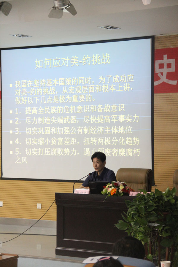 其次,张顺洪研究员引用胡锦涛总书记在建党90周年之际的讲话,指出我国当前面临的各种机遇和挑战,由此切入到本次报告的主题。他提出“我国面临最大的、长期存在的威胁,莫过于来自北约的挑战。”张顺洪研究员分析了当今世界格局及其发展趋势,从宏观上来说,就是单极化与多极化的较量,主要表现为中美之间的较量。