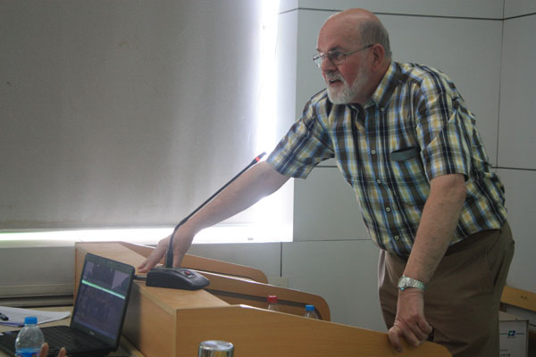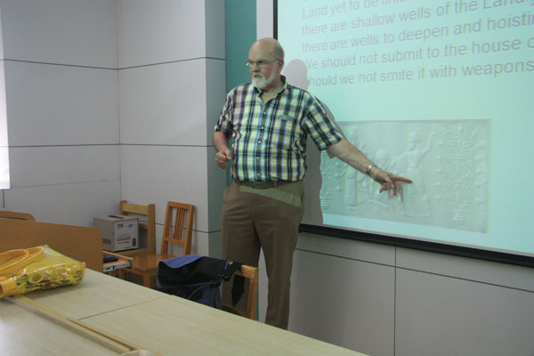 首先,霍文勇博士简要介绍了克里斯潘博士,作为当今世界研究两河流域社会民主政治、语言和古典音乐的著名学者专家,著述众多。克里斯潘教授运用丰富的图片资料,生动形象地展示出早期美索不达米亚的历史风貌。克里斯潘博士指出,在研究早期两河流域历史文明时,正确选择、认识、鉴别和校正古典文献资料是十分重要的,并对早期议事会进行了详尽深入的研究探讨与系统分析。首先,简要介绍了两河流域的自然地理环境与历史文化北背景,并就早期陶器上的一些刻画符号与文字记录,以及裸体男性与女神造型的存在进行了解释说明,分析了早期文明遗址留存,国王与民众投身于一系列宗教祭祀活动,王权神授的重要性。克里斯潘博士从神话史诗英雄人物的故事出发引出早期社会民主政治结构中的议事会,根据文献分析指出,作为重要议事决策机构的议事会是有国王作为领导主持的,分为长老议事会和青年人议事会两部分,就一些战争、资源等重要事件进行探讨,提出重要的参考意见,体现当时的一种民主制度。