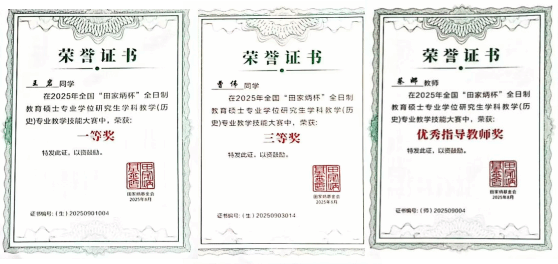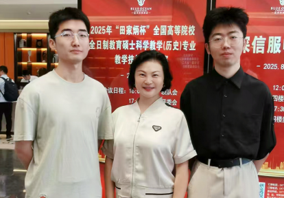 2025年8月22-25日,“田家炳杯”全国高等院校全日制教育硕士学科教学(历史)专业教学技能大赛决赛在内蒙古师范大学赛罕校区举行。大赛由“田家炳杯”全日制教育硕士专业学位研究生学科教学(历史)专业指导委员会指导,内蒙古师范大学承办,共有来自全国84所高校的162名选手参赛,最终评选出一等奖18名、二等奖37名、三等奖68名。经过两天的激烈角逐,我校MILE米乐集团学科教学(历史)专业2024级研究生王岩同学荣获一等奖、优秀教学设计奖,曹伟同学荣获三等奖、优秀教学设计奖,蔡娜老师荣获优秀指导教师奖。