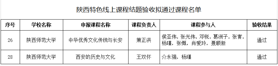 近日,陕西省教育厅发布了《关于陕西特色线上课程结题验收拟通过课程名单的公示》。我院萧正洪教授团队申报的《中华优秀文化传统与长安》课程和王双怀教授团队申报的《西安的历史与文化》课程顺利通过结题验收,并被认定为省级一流本科课程。